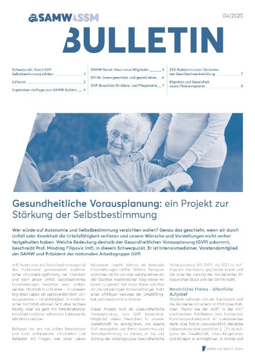 Die SAMW veröffentlicht ein vierteljährliches Bulletin in gedruckter Form. Neben einem umfassenden Schwerpunkt enthält es Informationen zu den laufenden Aktivitäten. Die jüngsten Ausgaben finden Sie hier, alle früheren Ausgaben sind im Online-Archiv zugänglich.