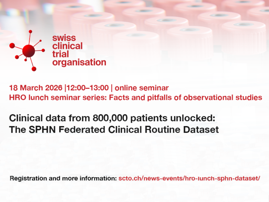 This online seminar by the Swiss Clinical Trial Organisation (SCTO) will provide an overview of the SPHN Federated Clinical Routine Dataset, a remarkable resource designed to give healthcare researchers access to vast amounts of patient data for further use research according to HRO chapter 3. The session is intended for researchers and study teams with planned, ongoing, or completed HRO projects (observational studies). Visit the website of SCTO to learn more about the programme, the speaker, and the registration process.